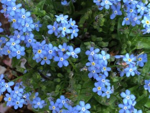 真愛が「ねえ。書いてよ。」と頼んだ勿忘草のネームプレートを隠すほどの勿忘草が咲きました。青く小さな花は15年以上種を取って繋いできた命です。