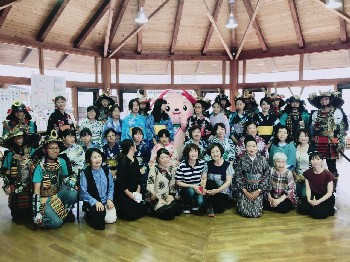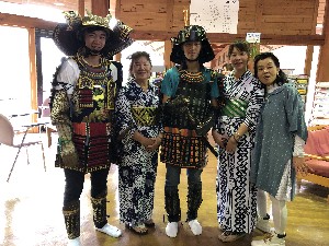 厚洋さんの兜の前で、真愛のお人形と一緒に説明できることが
