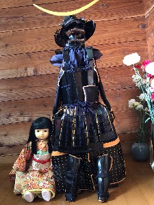 厚洋さんが20万円ぐらいかけて作った伊達政宗の甲冑と隣に座らせている真愛の市松人形です。