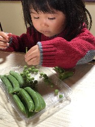 ニンジンご飯に入れるエンドウ豆を剥いてくれています。