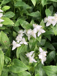 水無月の庭は、紫陽花に隠れるように咲く花がある。