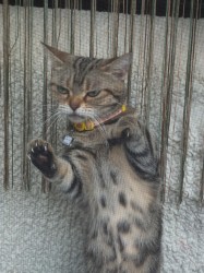 興奮して網戸を登ってしまい、爪が外れず「おまえ、猫のくせに!」とお父んに馬鹿にされながら下ろしてもらうちゃーちゃんです。